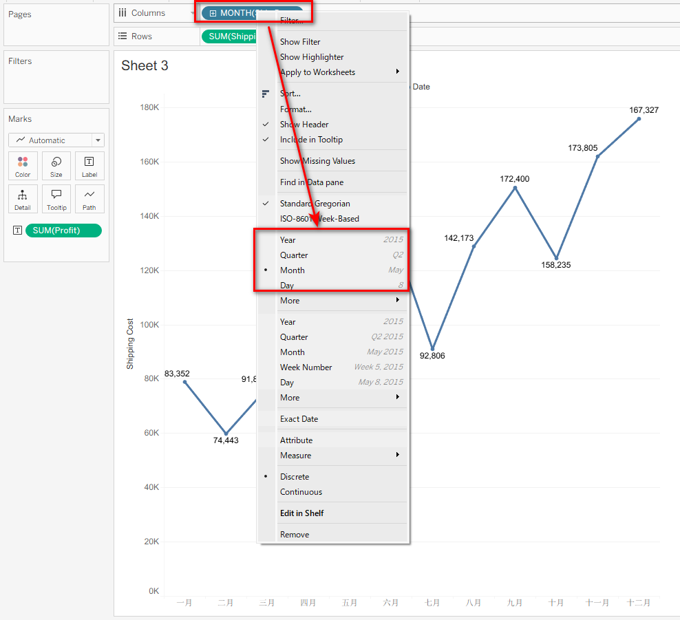 日期时间型的字段,我们可以右击选择,年,季度,月,日,就能够实现